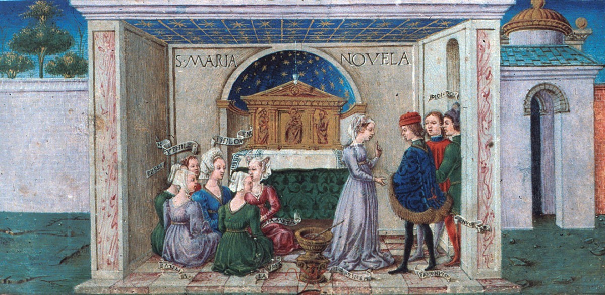 Укрывшиеся от флорентийской чумы в церкви Санта-Мария-Новелла. Миниатюра Таддео Кривелли к «Декамерону» Джованни Боккаччо. 1467 годBodleian Lipary, Oxford