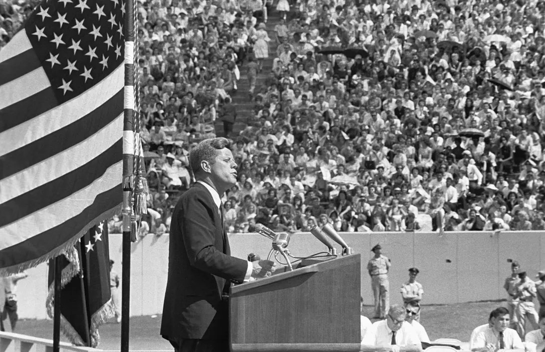 Президент Джон Кеннеди произносит свою знаменитую речь «Мы выбрали полет на Луну» в Хьюстонском университете Райса в сентябре 1962 года.