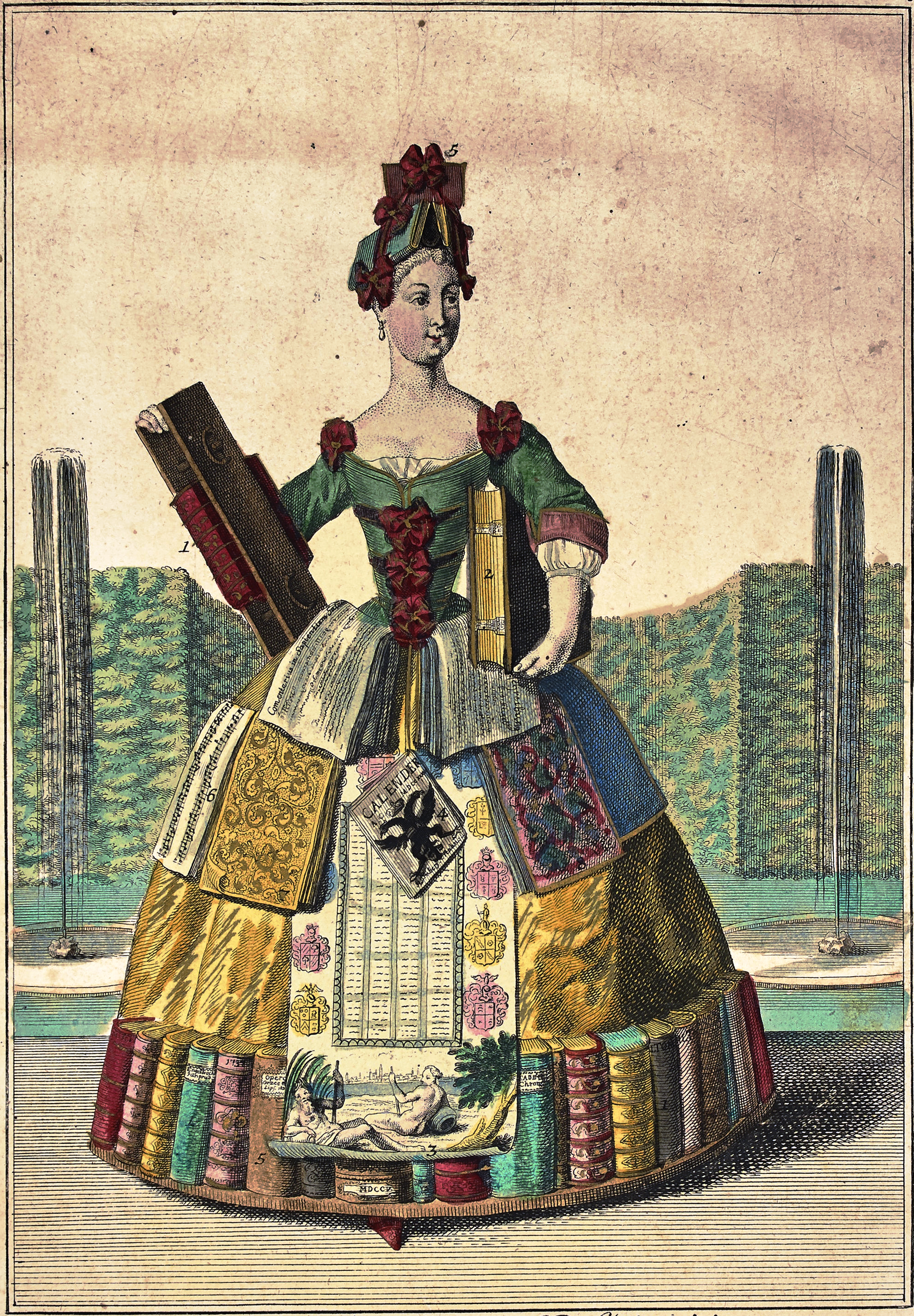 Более поздний, но не менее выразительный пример — коллекция цветных гравюр немецкого художника Мартина Энгельбрехта. Это своего рода ожившие эмблемы слагаемых профессионального мастерства. Вот книготорговка, облаченная в роскошный библиокостюм. А вот щеголеватый переплетчик, сконструированный из переплетных инструментов, уже готовых и еще не сброшюрованных книг. Инструменты часто обозначались цифрами и подписывались внизу на нескольких языках.