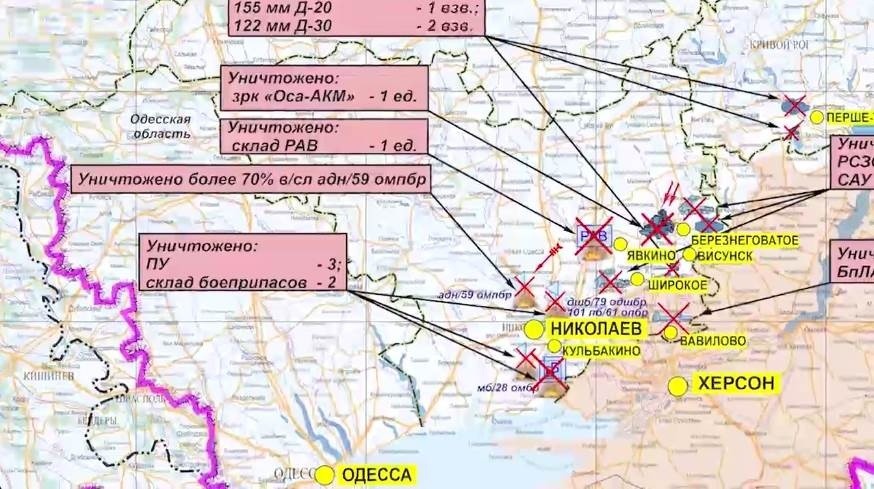 Боевая авиация ВС РФ поразила за сутки 8 пунктов управления, в том числе подразделений 14-й механизированной бригады в районе Соль (ДНР), 28-й механизированной и 79-й десантно-штурмовой бригад в районе города Николаев и 61-й пехотной бригады в районе населенного пункта Полигон (Николаевская область).