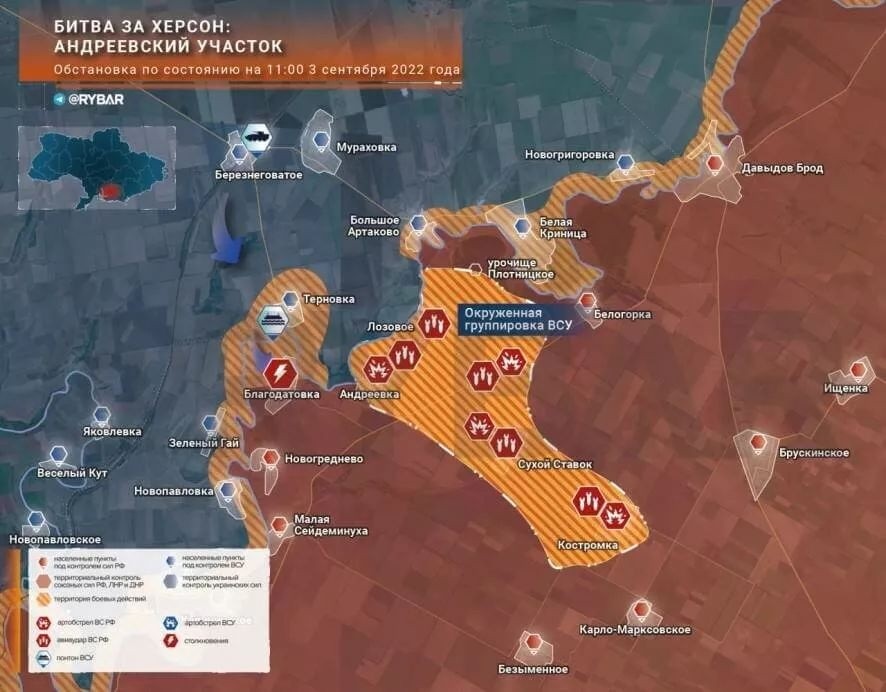 К настоящему времени соединиться с заблокированными на южном берегу остатками войск ВСУ так и не удалось, за Благодатовку идут бои.