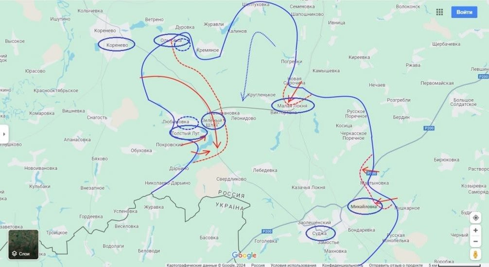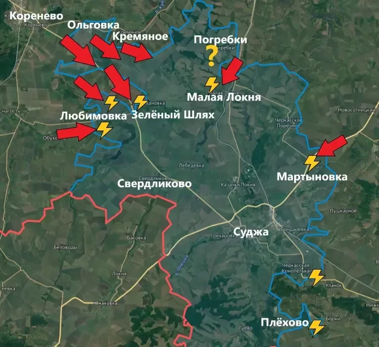 Также подразделения ВС РФ ведут бои в районе Малой Локни. По информации некоторых источников, штурмовые отряды Армии России уже зашли в населённый пункт. Обстановка чуть западнее, в районе Погребков, пока что под вопросом. Удалось ли нашим бойцам прорваться на этом участке - пока что неизвестно. Если всё-таки удалось, то в целом Армии России удастся срезать ещё один довольно большой выступ.