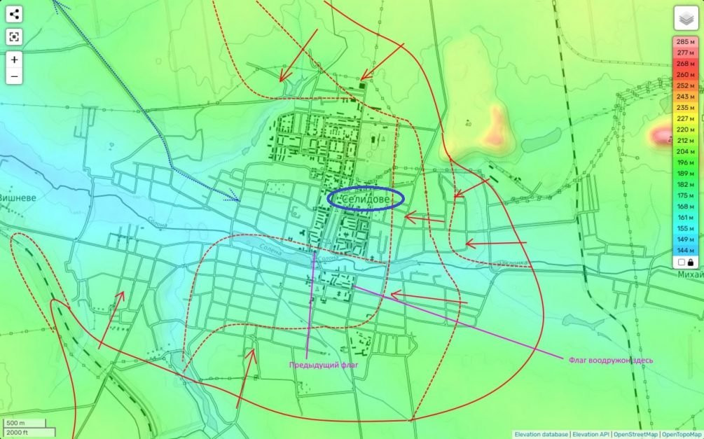 Кроме того, появилось видео, на котором также запечатлен флаг над Селидово. Судя по всему, штурм города проходит успешно. Южная часть Селидово, расположенная южнее реки Солёной, оказалась под контролем российских войск. Примечательно, что эта часть города почти цела, что может указывать на то, что противник не смог организовать здесь серьезное сопротивление.