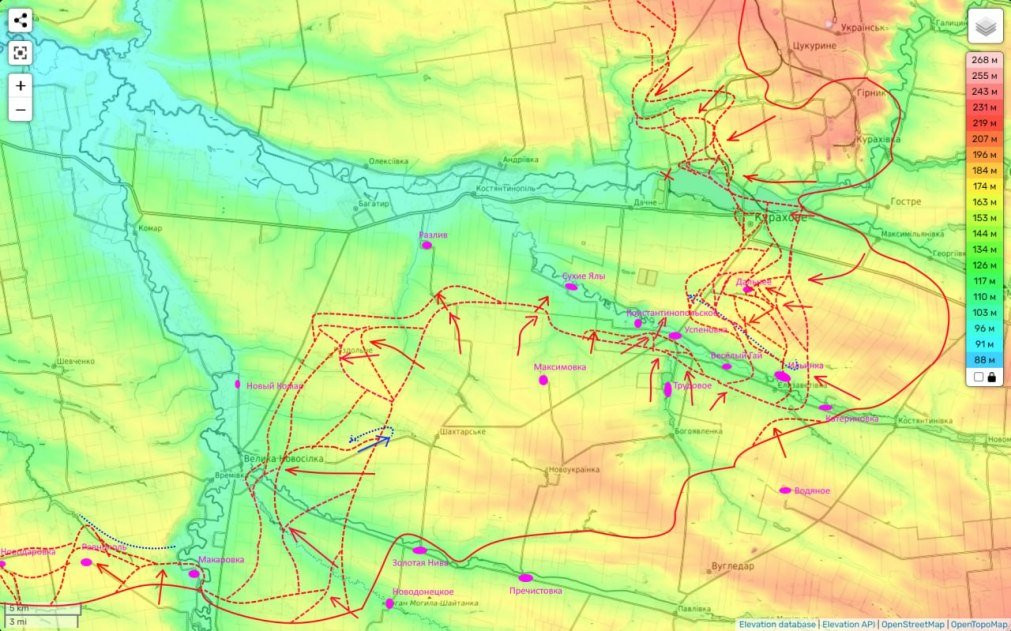 Причем последний мы по итогу дня заняли практически полностью, выбив из него гарнизон ВСУ. Более того, южнее Пушкино мы начали движение на следующее село Украинка. До восточных окраин которого нам осталось пройти чуть более 1 км. А западной окраиной это село уже стоит на трассе из Покровска на Курахово, к которой мы упорно и идем. До нее нам осталось пройти чуть более 3 км.