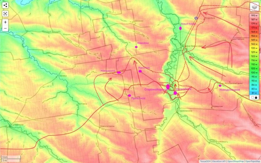 Также Подоляка рассказал о ситуации в Большой Новосёлке. В самом населённом пункте относительная стабилизация фронта. Причём, это вызвано не резко усилившимся здесь сопротивлением противника, а тем, что наши войска заняв восточные и юго-восточные окраины поселка, и произведя разведку своими ДРГ, и не увидев для себя угроз, просто держат блокаду Большой Новосёлки.