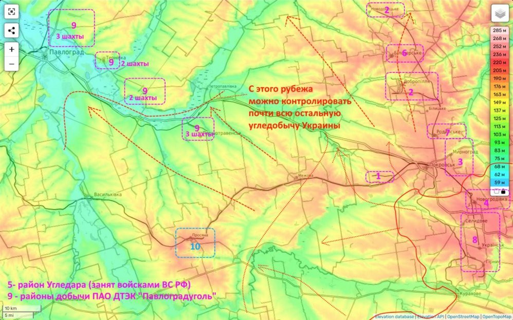 Вместе с этим в своём Telegram-канале Юрий Подоляка рассказал о значимости города Павлоград, который находится недалеко от Покровска. Он напомнил, что потеря Покровска приводит киевский режим к потере примерно 40% довоенной добычи угля на Украине. Но, и оставшийся уголь, который может еще помогать выплавлять оставшуюся сталь и обеспечивать поставки на большую часть украинских ТЭС тоже является частью Западного Донбасса и расположен очень компактно на 10 шахтах объединения «Павлоградуголь». Районы добычи которого сосредоточены в 4 узлах и на карте обозначен цифрой «9».