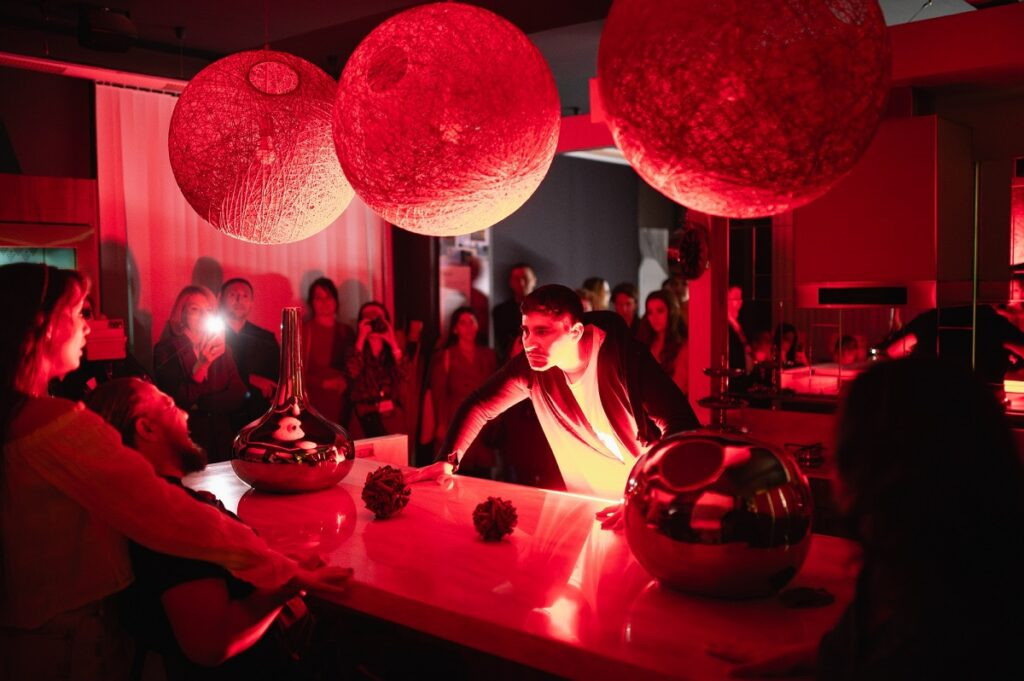 Действие спектакля началось прямо на производственной площадке «Марии», где перед этим прошла экскурсия для гостей. Затем актеры переместились в шоурум фабрики. Динамично менялись локации и сцены. Кухня-концепт Teatro, разработанная совместно с Жераром Депардье более 10 лет назад, оправдала наконец свое название. Интерьеры представали в новом свете и становились местом действия трагедии, в которую были вовлечены зрители.