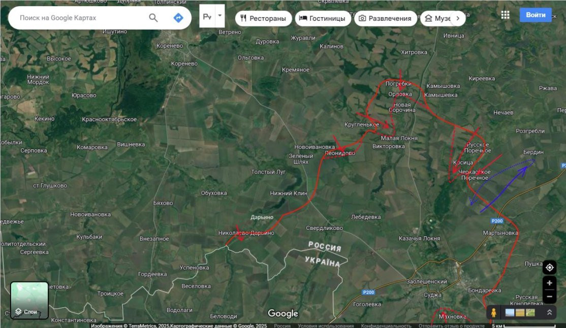Кроме того, российская армия атакует позиции ВСУ с юго-востока в сторону Суджи. На данном участке бои носят тяжёлый характер, но продвижение вперёд в Махновке фиксируется. Также наши части пытаются выбить противника из населённого пункта Николаево-Дарьино.