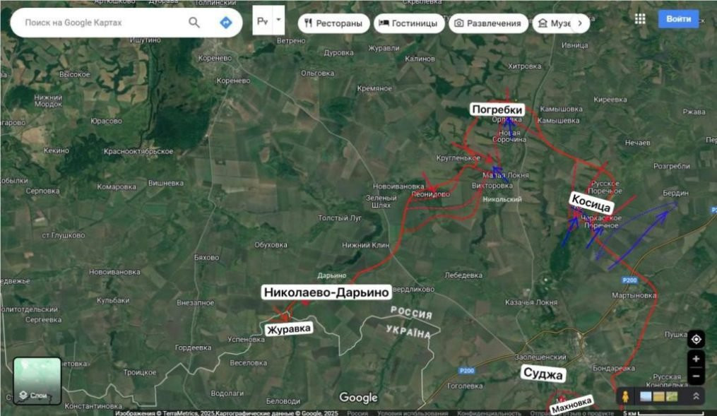 Кроме того, по данным военного эксперта Юрия Подоляки, армия России сделала хитрый манёвр, зайдя через границу в Сумскую область и в районе деревни Журавки атаковала врага, окопавшегося в селе Николаево-Дарьино, с юга.