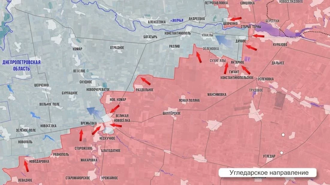 На Угледарском направлении вероятно, здесь будет некоторое снижение активности - наши будут подтягивать снабжение и проводить перегруппировку сил. Возможны несколько сценариев дальнейших действий. Первый: движение на запад вдоль дороги на Гуляйполе, во фланг Запорожскому направлению. Второй: движение к Богатырю и Комару и поворот по дороге на Запорожье. Третий: глубокий клин в оборону ВСУ к дороге Покровск-Днепропетровск. А пока бои идут в районе Нового Комара и Новоочеретоватого. К западу от Курахово тяжелые бои в Дачном, где ВСУ возвели мощные рубежи. Позиционные бои вдоль северного берега Сухих Ялов - от Зеленовки до Янтарного. Штурмы армии России идут по линии Улаклы - Константинополь. На другом берегу продолжается интенсивное встречное сражение в Андреевке. Под контролем ВС РФ северо-восточная окраина, противник мощно контратакует, чтобы удержать от полного «захлопывания» крышку Кураховского «котла».