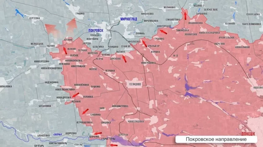 На Покровском фронте упорные бои в Удачном, где ВС РФ теснят ВСУ и приближаются к территории ж/д станции. В районе Котлино наши расширили подконтрольную территорию к северу и к востоку, в сторону Зверево. Чуть южнее продолжаются тяжелые бои в районе Успеновки - Новоалександровки. Еще ниже по карте сообщают об освобождении Надеждинки, там продолжается зачистка. До следующего села Котляровка чуть больше 4 км, а до Новопавловки - около 13 км. В Новоандреевке тоже есть успехи, бои сместились в соседнее Срибное. На восточном фланге бои на подступах к Новоукраинке и Чунишино. Сильные бои в районе Миролюбовки, Елизаветовки, Водяного Второго.