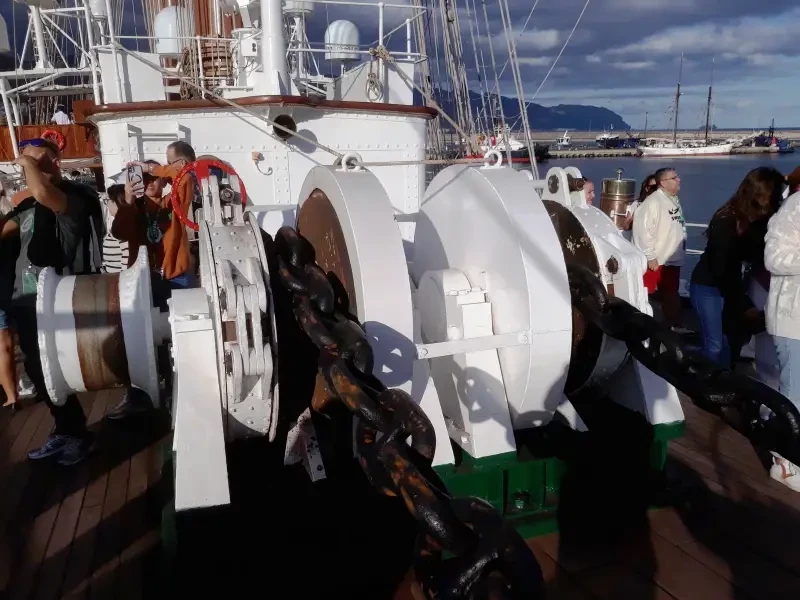 Якорное устройство состоит из двух якорей Холла весом по 2400 кг с якорными цепями калибром 53,97 мм и длиной 227,6 м (левый) и 261 м (правый якорь). Запасной якорь того же типа весом 2050 кг хранится на главной палубе. Брашпиль фирмы «Emerson Walker Thompson» электрогидравлический с тяговым усилием 23 000 кг. Для швартовых операций, управления бегучим такелажем, грузовых работ и т. д. используются четыре электрогидравлических лебедки и столько же ручных шпилей.