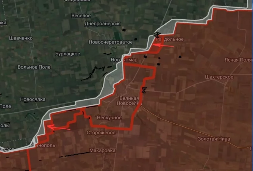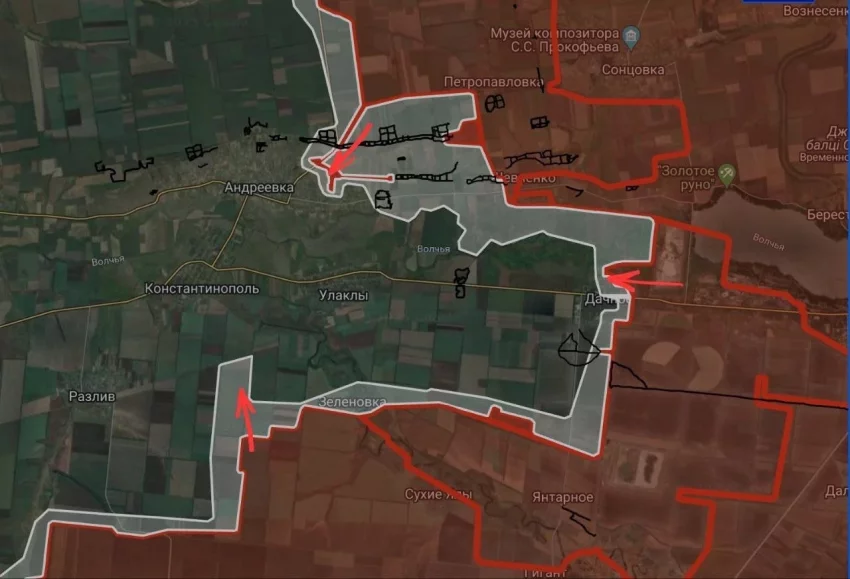 На Угледарском фронте ВС РФ широким фронтом двигаются к Новосёлке и Ровнополю. Западнее Раздольного наши зашли в ротный опорный пункт. Южнее Разлива удалось продвинуться примерно на 2 км, выбив ВСУ с выгодных позиций. ВС РФ атакуют здесь и восточнее Разлива к Богатырю. Идут ожесточённые бои за окружение ВСУ, застрявших в районе Дачное-Улаклы-Константинополь. На подступах к последнему ВС РФ атакуют с юго-востока опорный пункт ВСУ. Выход наших подразделений к трассе восточнее Улаклы приведёт к окружению подразделений ВСУ в Дачном и южнее вдоль балки. В самом Дачном враг теряет устойчивость обороны, но еще бьется. В Андреевке ВС РФ расширяют зону контроля в северо-восточной части, пробиваясь к центру села. ВСУ выбиты с ряда позиций восточнее, а севернее наши атакуют позиции ВСУ на высотах.