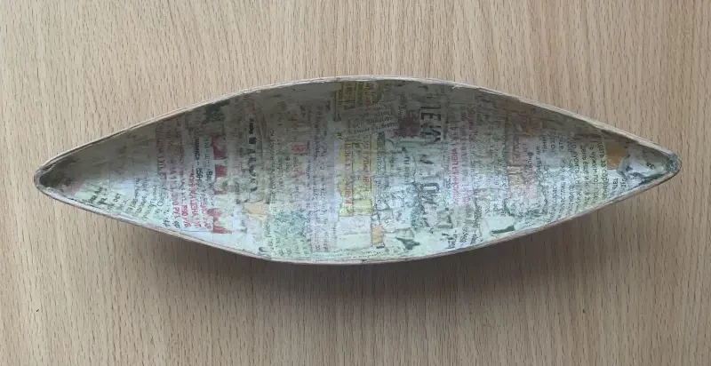 Теперь пластилиновый корпус в три слоя покрывается кусочками размоченной в воде газетной бумагой: первый слой только на воде, вторые два на клею ПВА. Хорошо просушив бумажную «скорлупу» и обрезав свисающие с корпуса края, оклеиваем ее палочками-мешалочками для кофе, стараясь по возможности укладывать их как можно плотнее. Клей – ПВА.