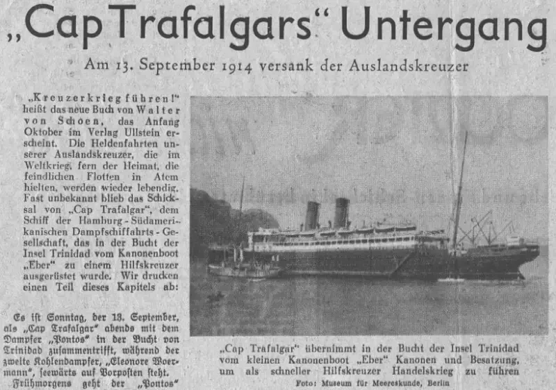 Бой германского вспомогательного крейсера «Кап Трафальгар» с британским вспомогательным крейсером «Кармания». В этом случае подавляющее превосходство в артиллерии также было на стороне английского корабля – 8*120-мм пушек против 2*105-мм. «Кап Трафальгар» не мог уйти, поскольку уступал в скорости «Кармании», и вынужден был сражаться, а результат получился близок к ничейному. «Кап Трафальгар» погиб, но и «Кармания» получила настолько критичные повреждения, что ее с трудом довели до ближайшего порта.