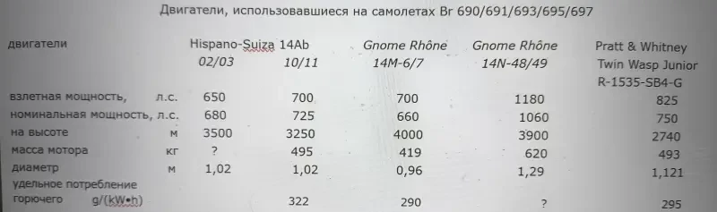 Но самое главное — чтобы обеспечить горизонтальную маневренность на уровне одномоторных истребителей, максимальный взлетный вес был ограничен тремя тоннами, что было чистой фантастикой, и лишь позднее (когда — неизвестно) эта цифра была увеличена до 3,5 тонн. Это, в свою очередь, ограничило выбор мотоустановки: либо моторы водяного охлаждения Salmson или Renault мощностью не более 450 лошадиных сил (л.с.), либо моторы воздушного охлаждения — 14М Mars и 14Ab фирм Gnome et Rhône и Hispano-Suiza соответственно, мощности которых на тот момент едва перевалила за 600 л.с. Причем в последнем случае министерство авиации навязывало именно второй — и не потому, что он был лучше, нижеприведенная таблица показывает обратное, а чтобы разрушить монополию фирмы Gnome et Rhône. А уж как фирмы будут укладываться в ограничения по весу с более тяжелыми двигателями — это их дело.