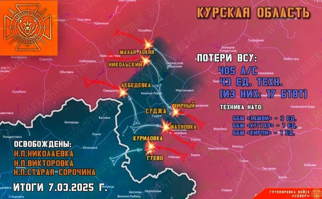 В свою очередь Telegram-канал "Северный ветер" следующим образом описывает главные события в зоне боевых действий в Курской области за минувшие сутки: