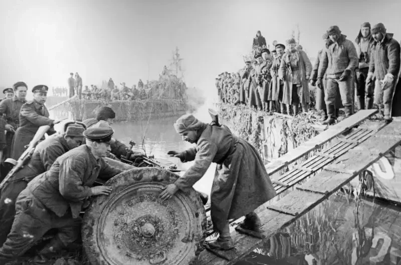 Погрузка на катера советского десанта с артиллерией на реке Дунай в Венгрии. Солдаты закатывают на сходни 76-мм полковую пушку образца 1927 года