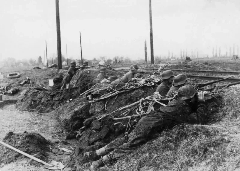 Немецкий оборонительный рубеж у железнодорожной насыпи. Венгрия. 1945 г.