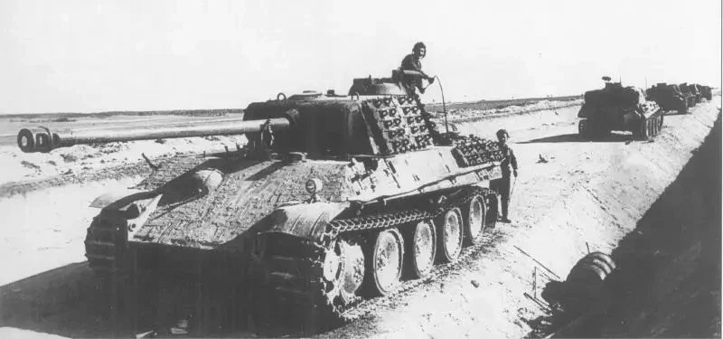 Колонна немецкой бронетехники, уничтоженная из засады советской артиллерией на границе Венгрии и Австрии, в районе города Детриц. На переднем плане танк Pz.Kpfw. V «Пантера» и осматривающие его советские солдаты. Март 1945 г.