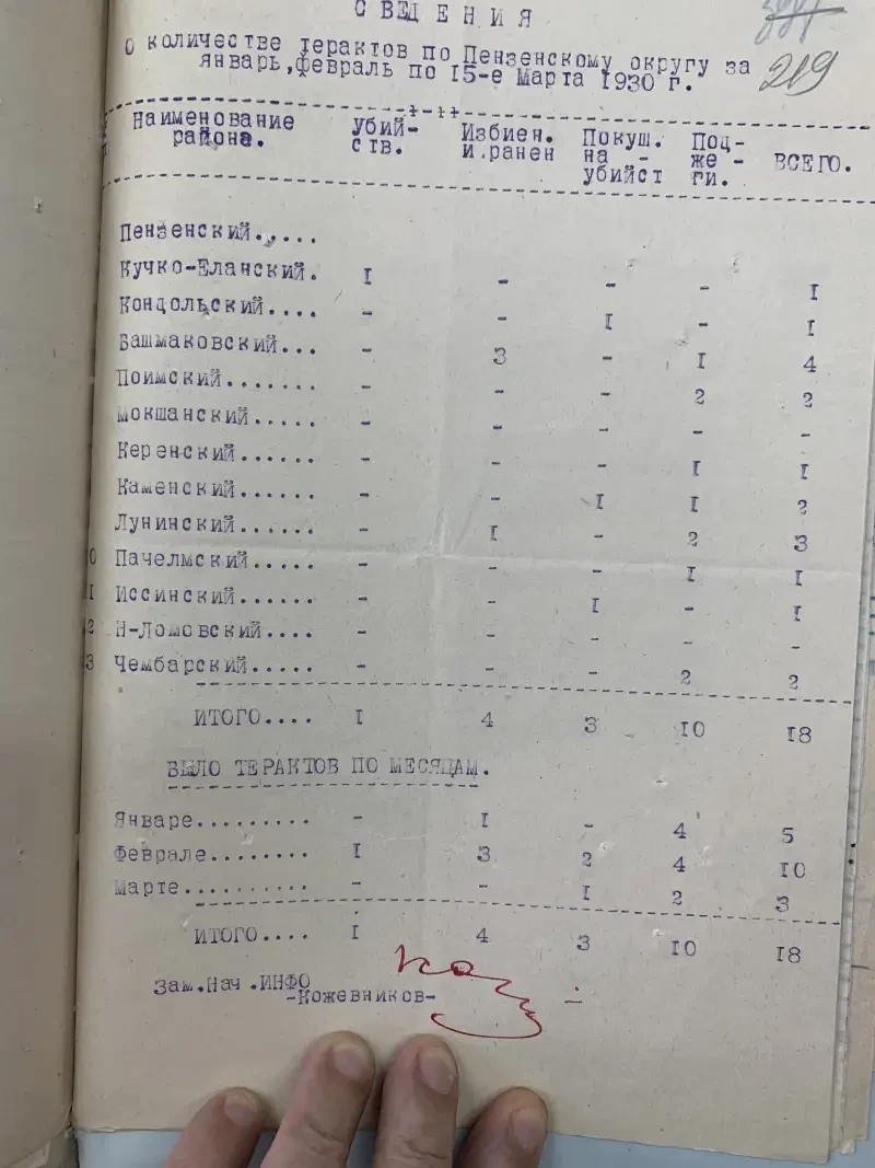 Отчет о терактах с января по март 1930 г. Убийство одно, избиений четыре… А в целом не так уж и много, да и какие уж это теракты? Но… Важно правильно «явление» назвать. Если пырнули ножом в пьяной драке, то это бытовка, а вот если зарезали сельского активиста, то, разумеется, это теракт. Так органы повышали собственную значимость, а количество терактов по стране росло, словно снежный ком, со всеми вытекающими из этого последствиями!