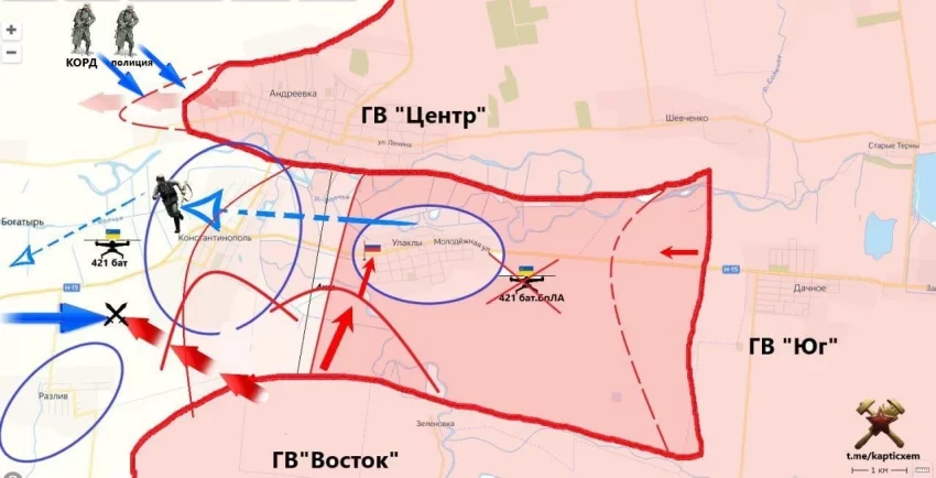 На Бурлацком направлении российские войска заняли «карман» южнее н.п. Привольное. Об этом сообщает Telegram-канал "Два майора".