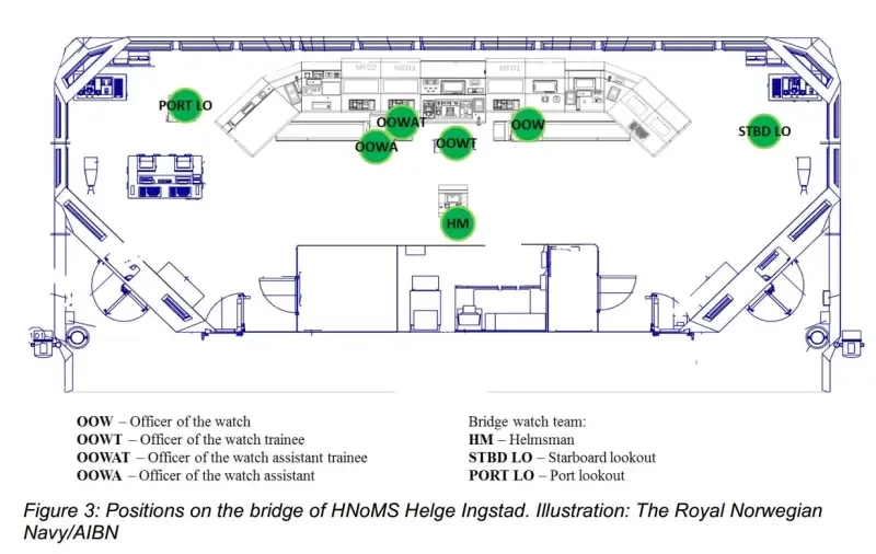 На мостике находилось 7 человек. Вахтенный офицер (OOW), как и положено, за всё отвечал и всё контролировал, а кроме него, было еще три офицера: дублер вахтенного офицера (OOWT), помощник вахтенного офицера (OOWA), дублер помощника (OOWAT). Трое рядовых моряков выполняли функции впередсмотрящих и рулевого, периодически подменяя друг друга. Дублеры офицеров занимались определением положения судна, используя электронные карты (ECDIS) и оптические средства. Местного лоцмана на фрегате не было.