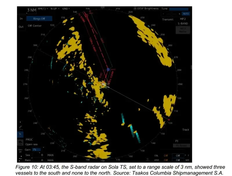 В этот момент радар S-band танкера был настроен на шкалу 3 мили, а радар X-band — на 1,5 мили. На радарах было видно лишь одно судно, проходившее мимо нефтяного терминала, но ни одна цель, приближавшаяся с севера, не была видна.