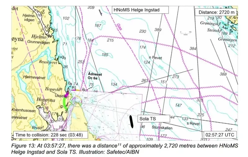 Оператор центра спустя некоторое время после запроса лоцмана с танкера вспомнил, что примерно в полтретьего военный корабль извещал центр о входе в его зону действия. Он немедленно связался с лоцманом по УКВ и в 03:59:46 сообщил тому, что, по всей вероятности, приближающееся судно — военный корабль Helge Ingstad.
