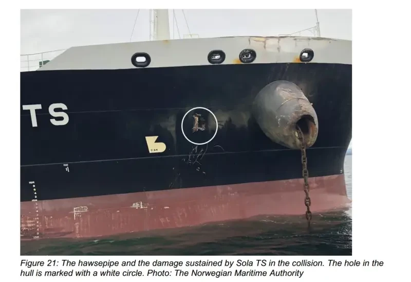 На танкере в результате удара был потерян якорь вместе с 30 метрами якорной цепи. Был немного помят якорный клюз, и чуть в стороне от клюза в борту танкера появилось небольшое отверстие.