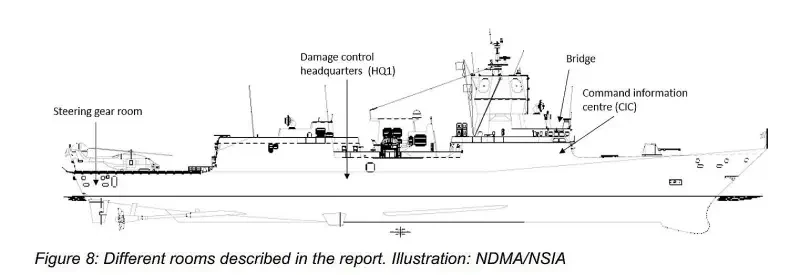 На одном из экранов CCTV было видно поступление воды в кормовой отсек дизель-генераторов. На пульте звуковой связи, которая была основным средством связи между различными помещениями фрегата, был отмечен отказ нескольких линий, включая связь с механиком в посту контроля живучести. Тогда СА вызвал одного из команды, назначенной выяснять повреждения, и направил его в радиорубку, чтобы попытаться восстановить систему внутренней связи. Далее он вызвал (непонятно каким образом, сказано просто "called") механика, чтобы тот прояснил ситуацию, но механик и сам не знал никаких подробностей. Командир фрегата, поскольку внешняя связь не работала, взял мобильный телефон и пошел на мостик, чтобы связаться с дежурным по штабу ВМФ и объявить ему о столкновении. По пути на мостик его настигла команда ‘brace-brace-brace’ по громкоговорящей связи.