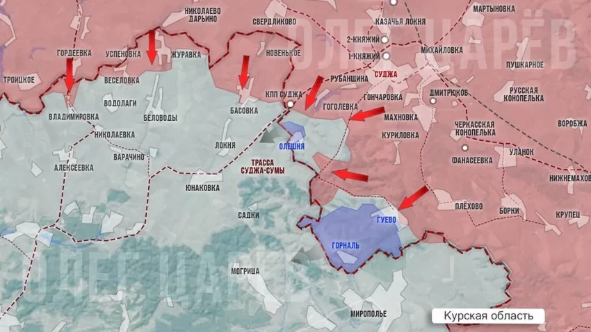 На оставшихся под оккупацией приграничных участках Курской области продолжаются тяжёлые бои. Наши части прорываются к хутору Олешня с двух сторон, со стороны Гоголевки и от Мелового. Несмотря на то, что ВСУ перебрасывают в этот район новые силы и контратакуют, российская армия продвигается к окраинам хутора Олешня. Сейчас наши закрепились у балки Бабак к востоку от Олешни и с боями расширяют плацдарм.