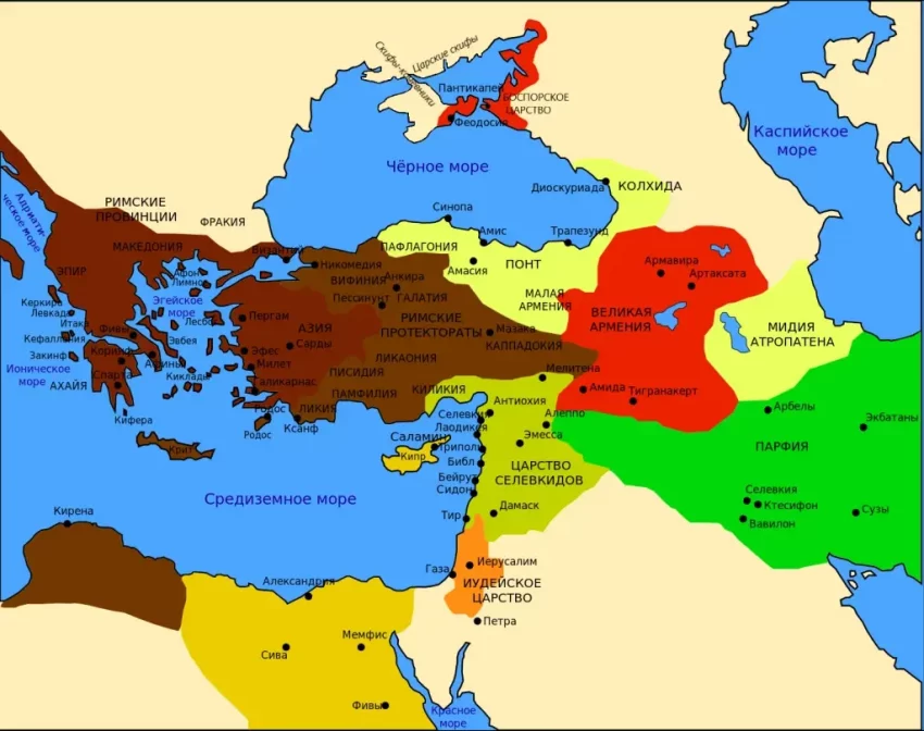 Царь был не в духе, и все придворные чувствовали это и старались лишний раз не попадаться ему на глаза. Дело в том, что Фархад отличался крутостью нрава, и разгневать его ничего не стоило. Причем все отлично понимали, что не успел он взойти на престол, как ему сразу же дали понять, что Парфия, его империя, уже не могла считаться главной державой на Ближнем Востоке. На севере угрозой стала Армения, которой правил Тигран Великий, и царство Понт Митридата VI Евпатора, заключившего с армянином союз. Тигран и Митридат VI призывали Фархада присоединиться к их войне против Рима, в то время как римляне, в свою очередь, пытались убедить его присоединиться к ним. Фархад давал обещания содействия обеим сторонам, но сам оставался пассивным. Он ждал исхода войны, чтобы воспользоваться ее плодами в интересах парфян.