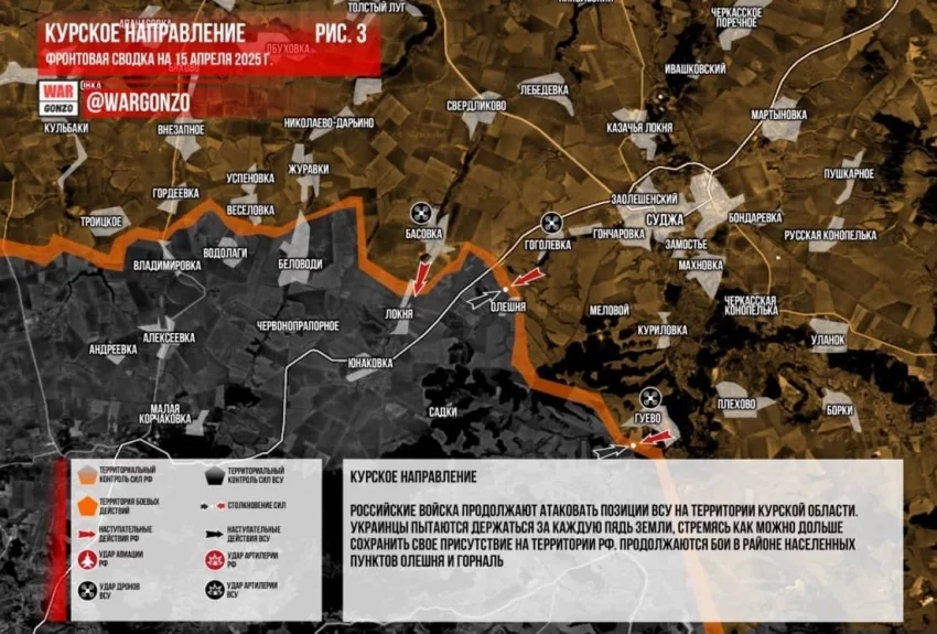В Курской области не смолкают тяжёлые бои восточнее Олешни: карта боевых действий по состоянию на 15.04.2025