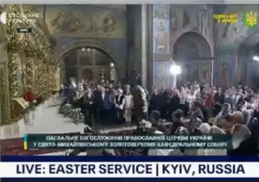 Дело в том, что во время трансляции пасхальной службы из Киева телеканал сопроводил её титрами на английском «Пасхальное служение, Киев, Россия». Позже «ошибку» исправили.