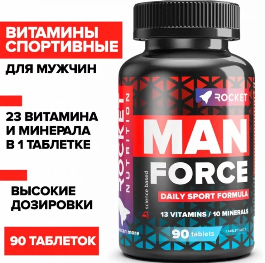 MAN Force от Rocket Nutrition — это идеальный выбор для мужчин, стремящихся улучшить свои спортивные результаты и общее состояние здоровья. Этот витаминно-минеральный комплекс содержит 28 необходимых витаминов и минералов, включая витамины A, B, C, D3, E и минералы, такие как цинк, железо и магний. Комплекс помогает повысить выносливость, стимулировать рост мышц, улучшить либидо и уменьшить стресс. Витамины MAN Force — это надёжный помощник для мужского организма, способствующий восстановлению и повышению силы.