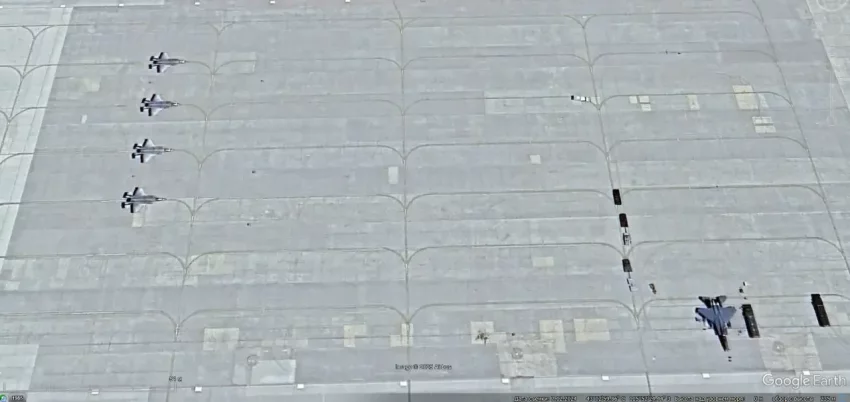 Спутниковый снимок Google Earth: истребители F-35A и F-15E на авиабазе Маунтин Хоум. Обратите внимание на разницу в геометрических размерах самолётов