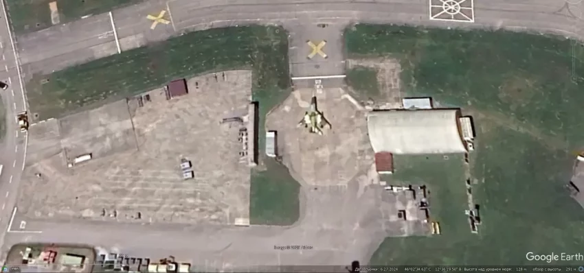 Спутниковый снимок Google Earth: истребитель-бомбардировщик Tornado IDS рядом с железобетонным укрытием на базе Авиано