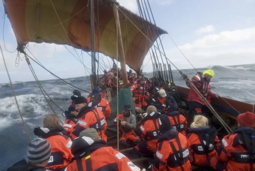 Современная реконструкция корабля викингов средних размеров. В комментах под предыдущей статьей было обсуждение про способность драккара идти под ветром. Этот кораблик, как видно, идет крутым бейдевиндом.