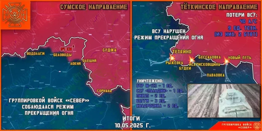 Несмотря на соблюдение группировкой войск "Север" режима прекращения огня, враг продолжает попытки прорыва вглубь Российской территории на направлении посёлков Тёткино и Новый Путь.
