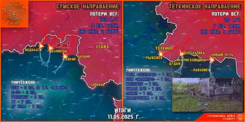 Также «Северный ветер» рассказал, что 11 мая группировка войск «Север» уничтожала передовые, инженерные и штурмовые подразделения ВСУ на Теткинском и Глушковском направлениях в Курской области.