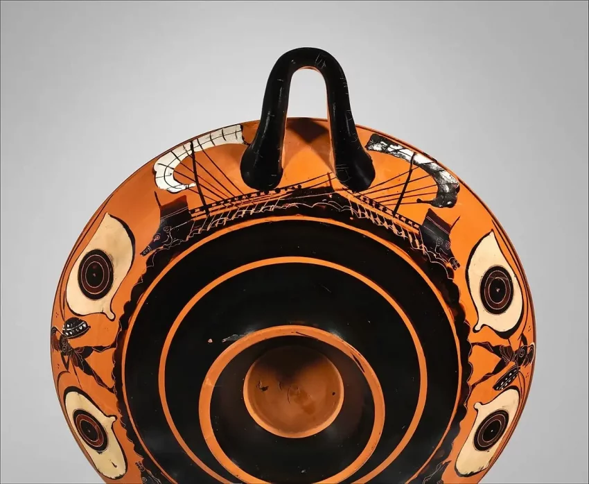 А это греческий килик – чаша для питья, 520 г. до н. э. И на ней изображены корабли того времени. Метрополитен-музей, Нью-Йорк