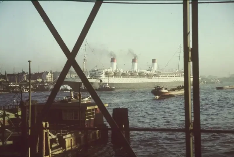 Немецкий пассажирский лайнер «Кап Аркона» (Cap Arcona) в порту Гамбурга. С 1940 по 1942 гг. судно использовалось как плавучая казарма. В 1945 году использовалось как плавучая тюрьма.