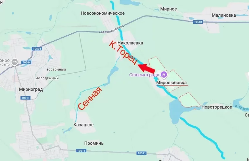 А выход западнее Казённого Торца создаёт усиливающееся давление на восточные окраины Мирнограда, лишая ВСУ возможности использовать реку в качестве естественной преграды. На пути у ВС РФ есть ещё река Сенная, но, во-первых, она является притоком Казённого Торца и потому существенно меньше него, во-вторых, у армии России есть позиции и южнее Сенной – со стороны ранее освобождённых Гродовки и Николаевки.