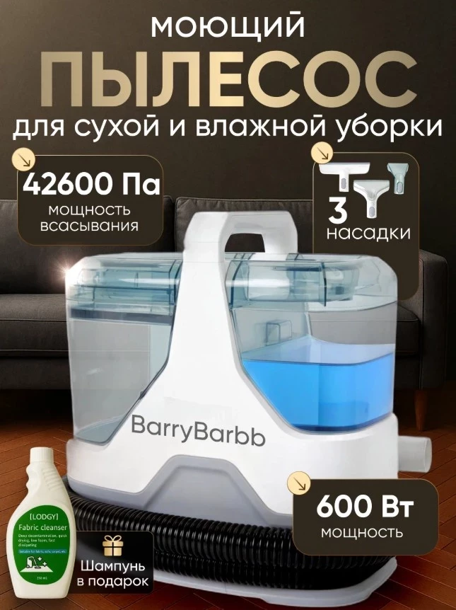 Если вы ищете пылесос химчистка для мебели и ковров рейтинг, обратите внимание на BarryBarbb — это технологически продвинутый и многофункциональный моющий пылесос, способный справиться с любыми бытовыми задачами. Мощность всасывания в 42600 ПА, насадки для мебели, ковров и стеклянных поверхностей, функция сбора жидкостей и визуальная индикация состояния устройства превращают BarryBarbb в удобный, умный и действительно мощный инструмент. Он не просто освежает обивку, а глубоко очищает, удаляя грязь, запахи и следы повседневной жизни.