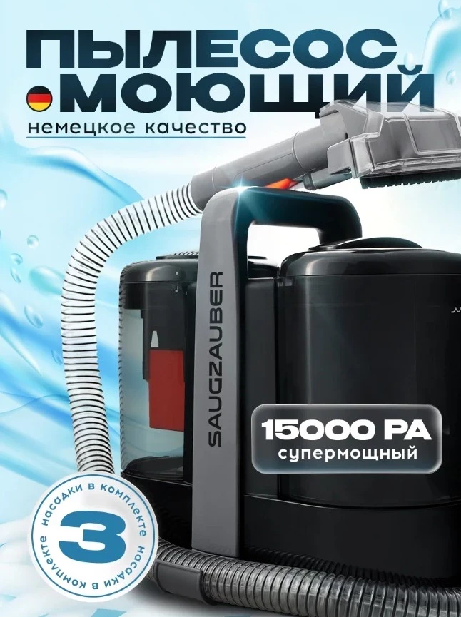 SAUGZAUBER W07-2G — это мощный и эргономичный помощник из сегмента «рейтинг пылесосов для химчистки мебели», созданный для глубокого очищения мягкой мебели, матрасов, автокресел и ковров. Он оснащён аквафильтром, мощным всасыванием в 600 Вт, длинным шнуром и комплектом продуманных насадок, справляется с шерстью, пылевыми клещами и въевшейся грязью на глубину до 6 см. Пылесос прост в уходе, автоматически отключается при заполнении бака и работает с любыми моющими средствами, что делает его универсальным решением для дома и авто.