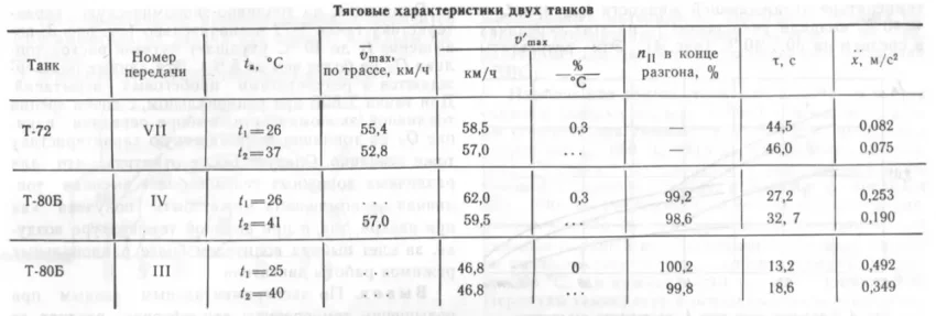 Среднее ускорение разгона уменьшалось: у танка Т-80Б на IV передаче на 1.6%, на III передаче на 1.9%; у танка Т-72 на VII передаче на 0.8% с повышением температуры на 1 °C. Продолжительность разгона на этих передачах у танка с ГТД при tₐ = 40-41 °C по сравнению с 25...26 °C стала больше на 20 и 40%, а у танка с поршневым двигателем при tₐ = 37 °C по сравнению с 26 °C — на ≈ 4%.