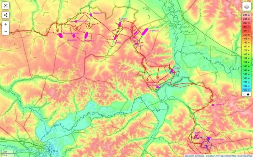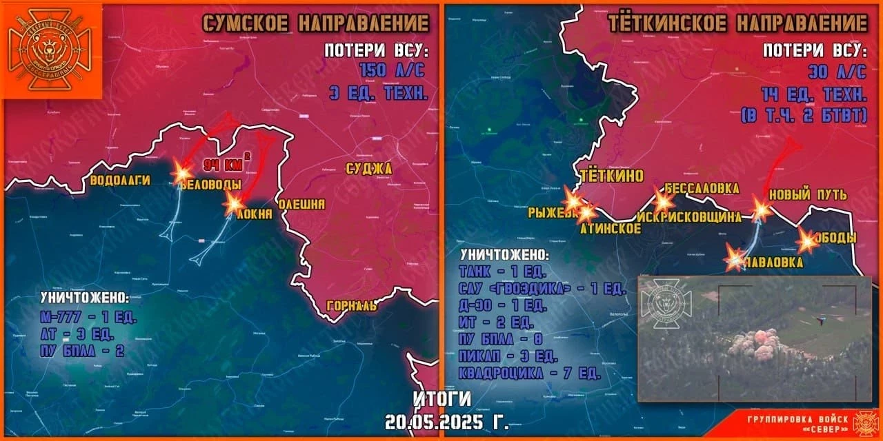 По его словам, в Сумской области был нанесен двойной удар по приграничным позициям украинских войск и их логистической системе. На месте ликвидированы два подразделения, направлявшиеся для усиления на Курскую область.