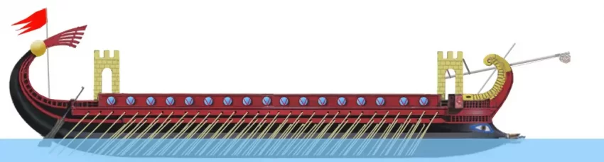 Легат понял, что корабль потерян, и, спустившись с башни, которая уже начала гореть, бросился к лодке, чтобы перейти на другой корабль. Оказавшись там, первым делом он приказал поднять темп гребли до 16 гребков за одно деление клепсидры и постараться атаковать и таранить странный дымящийся корабль с крутящимся бронзовым шаром.