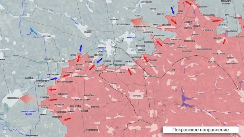 На Покровском участке ВСУ предпринимают попытки сдержать атаки ВС РФ, которые продвигаются по линии Запорожье-Троицкое-Орехово. Выше по фронту, на левом фланге охвата Покровска – тяжёлые позиционные бои без существенных перемен. На правом – такое же тяжёлое сражение в районе Малиновки.